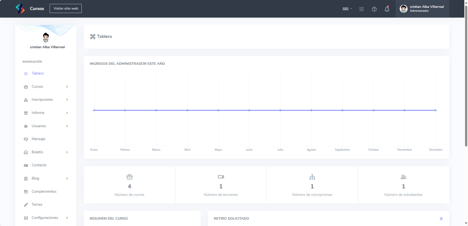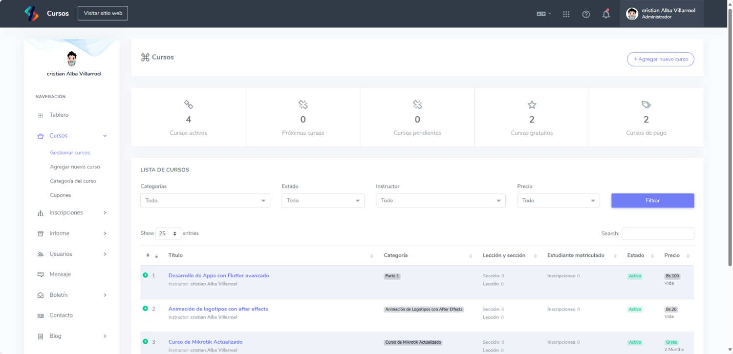 Administrador de cursos: crea cursos con contenido multimedia y clases en vivo.